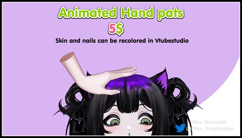 I´m now presenting a wonderful hand that you can recolor yourself in Vtube studio and give you the greatest rub ever ! Make your chat use channel points on twitch to give you a little pat on the head ! You will receive a zip file once the item is purchased !Includes NO .gif file ( FIXED) You no longer have to apply the animation yourself. just place the files into the "items" folder and it will work.!IMPORTANT !1) Place the files in vtube studios "live2d model" file, if you want to recolor the assets, if you do not wish to recolor, place the files into the "items" folder. An option to recolor will be given once you do step 2.2) To save it as an asset click on the green star icon on the left side in Vtube studio and then click on " load current model as Live2D item. By doing this it will create a file in the folder "items" that you can use as an asset and you will also be given the option to recolor.To see a video of it click on the link below !https://www.youtube.com/watch?v=qCI_hB4ZqsMTwitter:https://twitter.com/Misu_PurpleNeko