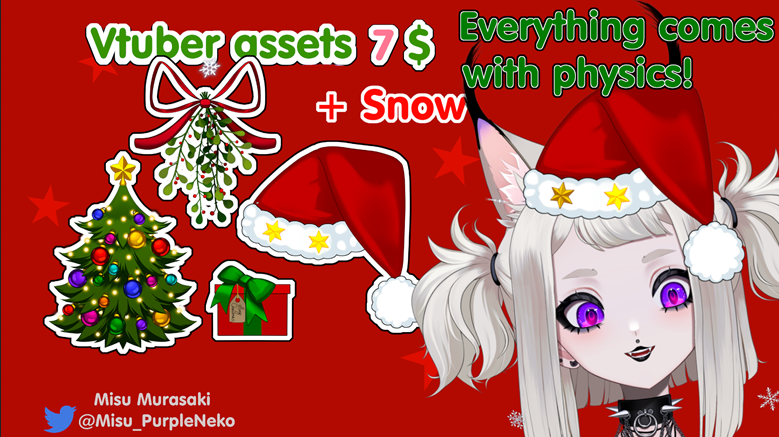 Christmas assets are now here ! Celibrate christmas with these super cute hats ! and why not lure your crush under the mistletoe and give them their absolute best kiss ever??! once yous purchase is complete you will receive a zip file which contains: -3 different hats with physics - 1 snow fall background - 1 animated Mistletoe Merry christmas!!IMPORTANT ! Place the files in vtube studios #live2d model" folder.Some of the assets need their animation applied, go to idle animation and select whatever shows up there and you´re done!Click on the link below to watch a video of them !https://www.youtube.com/watch?v=MdOkHjGDmtYTwitter:https://twitter.com/Misu_PurpleNeko