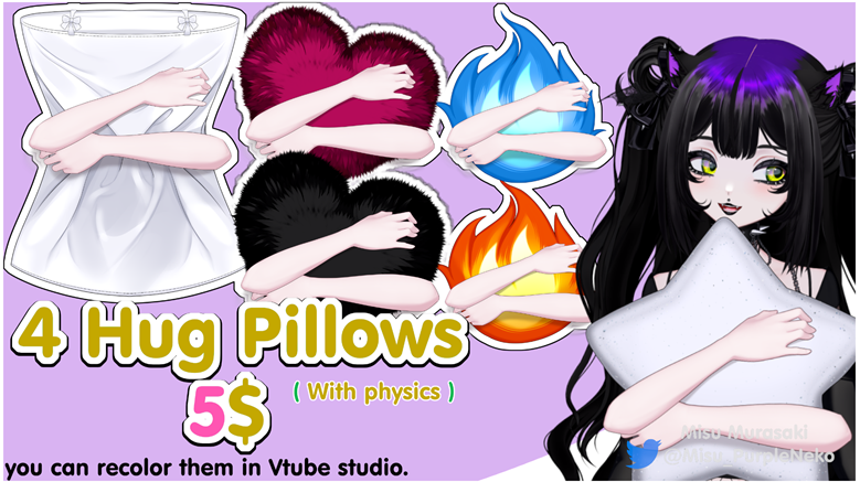 Helloes ! here you have 4 pillows that is rigged with physics ! The arms and pillows can be recolored in Vtube studio into your desired shade! Hope they will come in handy if you´re playing horror games or just want to be cozy ♥!IMPORTANT ! Place the files in vtube studios #live2d model" folder.Click on the link below to watch a video of them !https://www.youtube.com/watch?v=AWphXhsgp4ETwitter:https://twitter.com/Misu_PurpleNeko