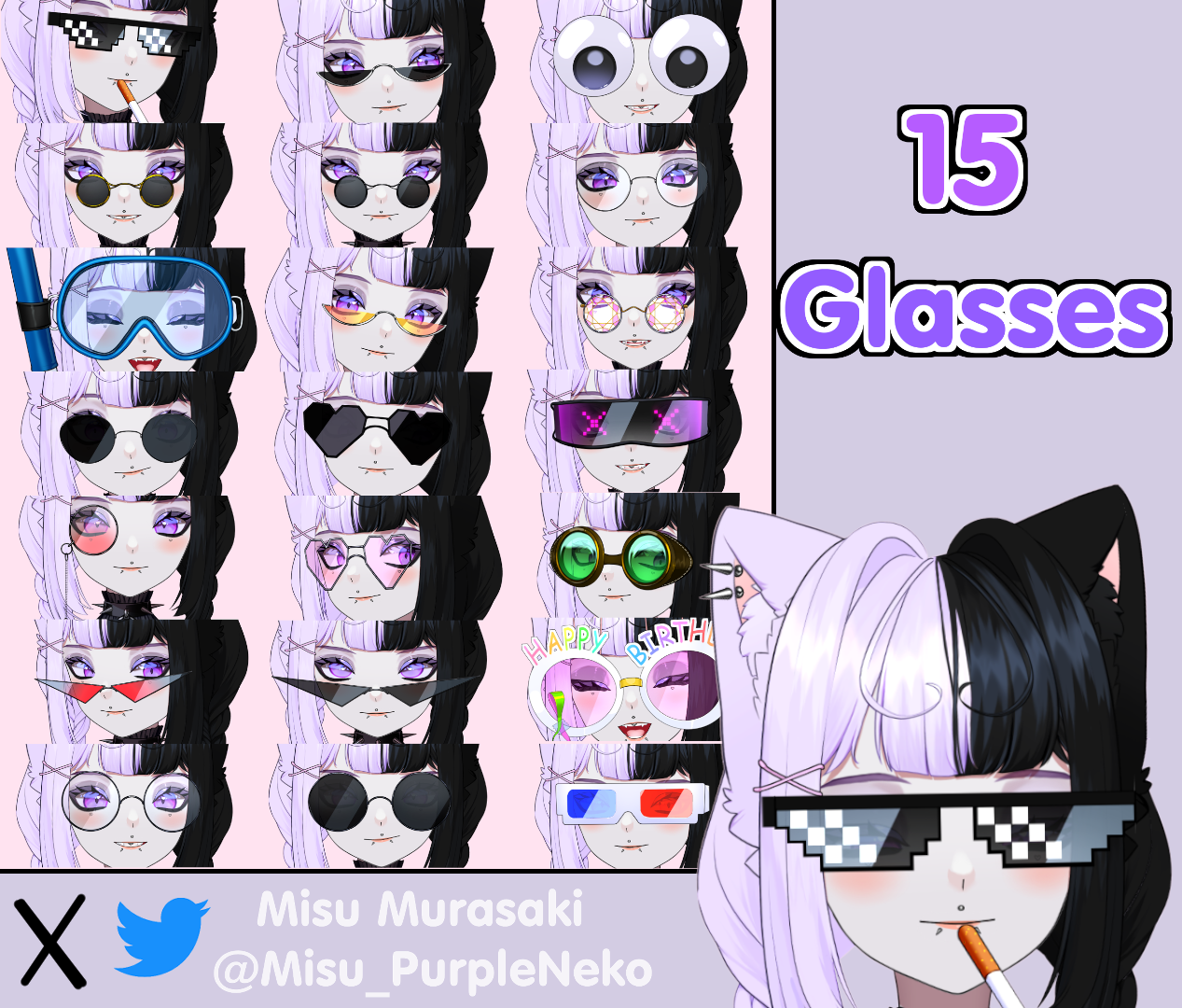 Hello guys! I have worked on some glasses for you all <3 Drawn and rigged by me ! you will receive: 15 pairs of Glasses rigged in Live2D for Vtube studio.!IMPORTANT ! : The glasses will be invisible when you load them in since they are in the same folder, you have to go to the key toggles and select a key for the glasses that you want to use ! Place the files in vtube studios #live2d model" folder.Note: I will fix this in the future so that you have the glasses in each separate folder! So if you have them already you will be able to download the updated version once it comes out. <3The reason why I added them in the same folder is that you only have to pin ONE pair of glasses to your face and the rest will pin on the same spot.https://www.youtube.com/watch?v=zhJYGV-InDY&t=1stwitter:https://twitter.com/Misu_PurpleNeko