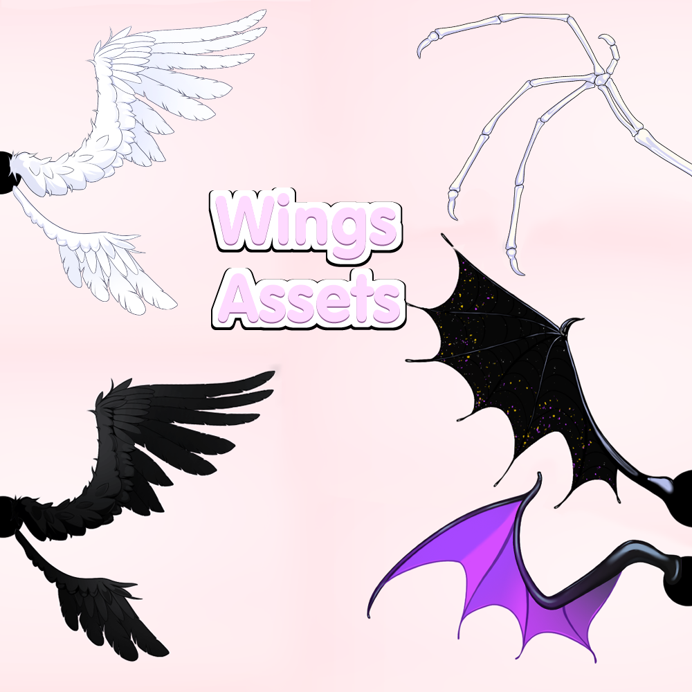 5 different Wings Assets !You can purchase these as a whole pack bundle or purchase them separately.The video shows in the TOP right corner which files the current asset shown are supported with. Simple setup ♥Flop on !!IMPORTANT ! Place the unzipped files in Vtube studios "live2d model" folder. Refresh vtube studio and they will appear.Click on the link down below to see a video of them all!https://www.youtube.com/watch?v=DSFofVCwe8YTwitter:https://twitter.com/Misu_PurpleNeko
