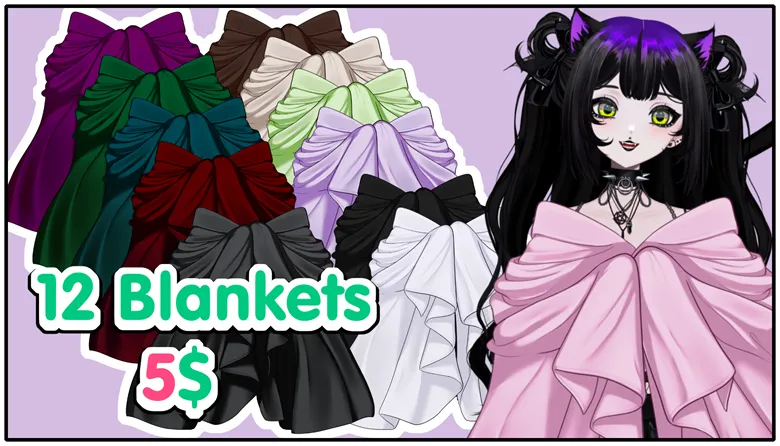 This is a Vtuber blanket asset that I made for you guys to purchase ! The blanket comes in 12 different colors and they are rigged in live2D which means that they move very flowy when you attach it on your own model! You will receive a zip file to unzip once you downloaded it. !IMPORTANT ! Place the files in vtube studios #live2d model" folder.To see all the blankets click on the video below !https://www.youtube.com/watch?v=-rxHrtCvOooTwitter:https://twitter.com/Misu_PurpleNeko
